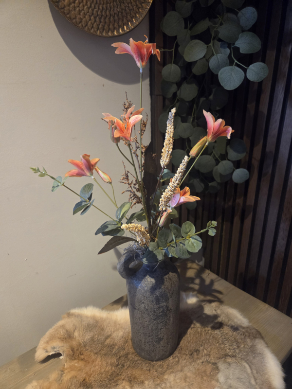 Opgemaakt met oranje/groen/crème Totale hoogte incl bloemen ca 55cm Het vaasje zelf is 25x10cm